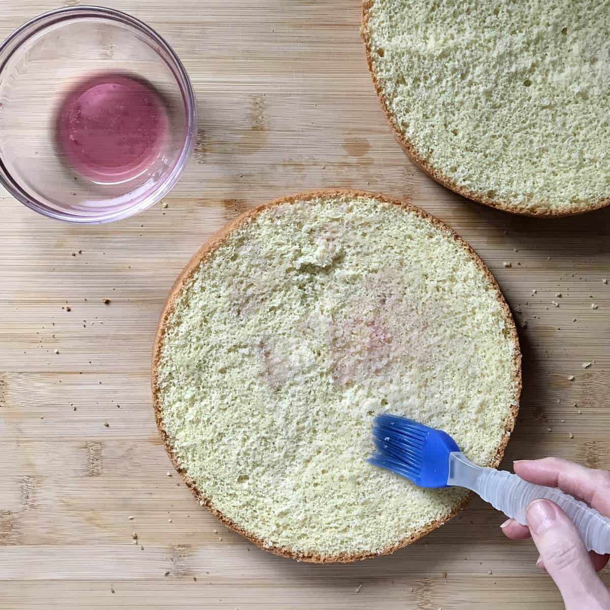 If desired, brush the cake with rum. Depending on how generous you are, you need about ¼ cup. I added a little pomegranate juice to imitate the color of Alchermes.